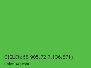 CIELCh 68.905,72.7,136.871 Color is a normal green color and the nearest color is Apple #4fa83d. Hex code #55be47 and RGB value is rgb(85,190,71). In RGB color space, this color is composed of 33% red, 75% green, 28% blue, In CMYK color space, this color is composed of 55% cyan, 0% magenta, 63% yellow , 25% black , In HSL color space, this color has a hue angle of 113° , 48% saturation and 51% lightness.