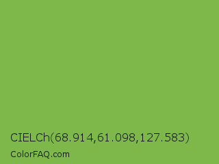 CIELCh 68.914,61.098,127.583 Color is a normal green color and the nearest color is Bud Green #7bb661. Hex code #7eb84b and RGB value is rgb(126,184,75). In RGB color space, this color is composed of 49% red, 72% green, 29% blue, In CMYK color space, this color is composed of 32% cyan, 0% magenta, 59% yellow , 28% black , In HSL color space, this color has a hue angle of 92° , 43% saturation and 51% lightness.