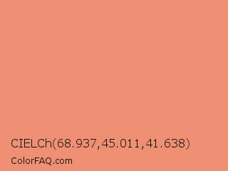 CIELCh 68.937,45.011,41.638 Color is a light red color and the nearest color is Apricot #eb9373. Hex code #ef8f74 and RGB value is rgb(239,143,116). In RGB color space, this color is composed of 94% red, 56% green, 45% blue, In CMYK color space, this color is composed of 0% cyan, 40% magenta, 51% yellow , 6% black , In HSL color space, this color has a hue angle of 13° , 79% saturation and 70% lightness.