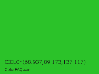 CIELCh 68.937,89.173,137.117 Color is a normal green color and the nearest color is Lime Green #32cd32. Hex code #2bc229 and RGB value is rgb(43,194,41). In RGB color space, this color is composed of 17% red, 76% green, 16% blue, In CMYK color space, this color is composed of 78% cyan, 0% magenta, 79% yellow , 24% black , In HSL color space, this color has a hue angle of 119° , 65% saturation and 46% lightness.