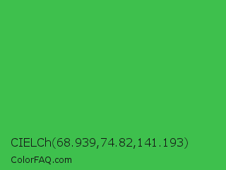 CIELCh 68.939,74.82,141.193 Color is a normal green color and the nearest color is Chateau Green #40a860. Hex code #3ec04d and RGB value is rgb(62,192,77). In RGB color space, this color is composed of 24% red, 75% green, 30% blue, In CMYK color space, this color is composed of 68% cyan, 0% magenta, 60% yellow , 25% black , In HSL color space, this color has a hue angle of 127° , 51% saturation and 50% lightness.