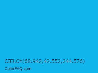 CIELCh 68.942,42.552,244.576 Color is a normal blue color and the nearest color is Cyan Process #00b7eb. Hex code #0fb5ed and RGB value is rgb(15,181,237). In RGB color space, this color is composed of 6% red, 71% green, 93% blue, In CMYK color space, this color is composed of 94% cyan, 24% magenta, 0% yellow , 7% black , In HSL color space, this color has a hue angle of 195° , 88% saturation and 49% lightness.