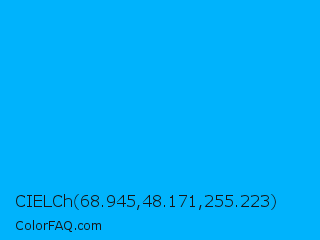 CIELCh 68.945,48.171,255.223 Color is a normal blue color and the nearest color is Blue Bolt #00b9fb. Hex code #00b3fc and RGB value is rgb(0,179,252). In RGB color space, this color is composed of 0% red, 70% green, 99% blue, In CMYK color space, this color is composed of 100% cyan, 29% magenta, 0% yellow , 1% black , In HSL color space, this color has a hue angle of 197° , 100% saturation and 49% lightness.