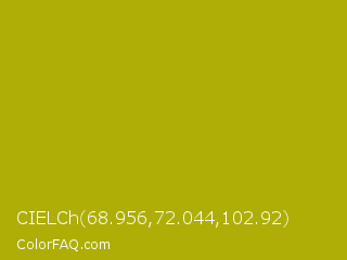 CIELCh 68.956,72.044,102.92 Color is a normal yellow color and the nearest color is Sahara #b7a214. Hex code #aeae06 and RGB value is rgb(174,174,6). In RGB color space, this color is composed of 68% red, 68% green, 2% blue, In CMYK color space, this color is composed of 0% cyan, 0% magenta, 97% yellow , 32% black , In HSL color space, this color has a hue angle of 60° , 93% saturation and 35% lightness.