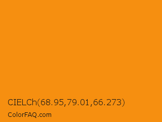 CIELCh 68.95,79.01,66.273 Color is a normal orange color and the nearest color is West Side #ff910f. Hex code #f68f10 and RGB value is rgb(246,143,16). In RGB color space, this color is composed of 96% red, 56% green, 6% blue, In CMYK color space, this color is composed of 0% cyan, 42% magenta, 93% yellow , 4% black , In HSL color space, this color has a hue angle of 33° , 93% saturation and 51% lightness.