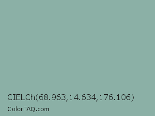 CIELCh 68.963,14.634,176.106 Color is a light cyan color and the nearest color is Cascade #8ba9a5. Hex code #8bb0a6 and RGB value is rgb(139,176,166). In RGB color space, this color is composed of 55% red, 69% green, 65% blue, In CMYK color space, this color is composed of 21% cyan, 0% magenta, 6% yellow , 31% black , In HSL color space, this color has a hue angle of 164° , 19% saturation and 62% lightness.