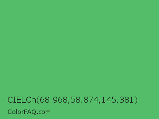 CIELCh 68.968,58.874,145.381 Color is a normal green color and the nearest color is Fern #63b76c. Hex code #54bd69 and RGB value is rgb(84,189,105). In RGB color space, this color is composed of 33% red, 74% green, 41% blue, In CMYK color space, this color is composed of 56% cyan, 0% magenta, 44% yellow , 26% black , In HSL color space, this color has a hue angle of 132° , 44% saturation and 54% lightness.