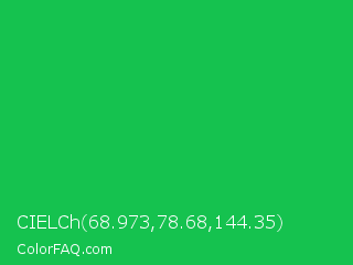 CIELCh 68.973,78.68,144.35 Color is a normal green color and the nearest color is Malachite #0bda51. Hex code #15c24f and RGB value is rgb(21,194,79). In RGB color space, this color is composed of 8% red, 76% green, 31% blue, In CMYK color space, this color is composed of 89% cyan, 0% magenta, 59% yellow , 24% black , In HSL color space, this color has a hue angle of 140° , 80% saturation and 42% lightness.