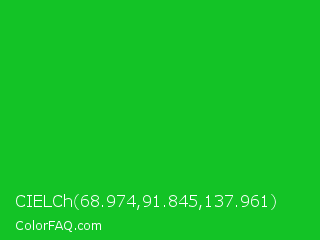 CIELCh 68.974,91.845,137.961 Color is a normal green color and the nearest color is Vivid Malachite #00cc33. Hex code #13c326 and RGB value is rgb(19,195,38). In RGB color space, this color is composed of 7% red, 76% green, 15% blue, In CMYK color space, this color is composed of 90% cyan, 0% magenta, 81% yellow , 24% black , In HSL color space, this color has a hue angle of 126° , 82% saturation and 42% lightness.