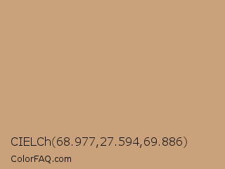 CIELCh 68.977,27.594,69.886 Color is a light orange color and the nearest color is Light French Beige #c8ad7f. Hex code #c9a17a and RGB value is rgb(201,161,122). In RGB color space, this color is composed of 79% red, 63% green, 48% blue, In CMYK color space, this color is composed of 0% cyan, 20% magenta, 39% yellow , 21% black , In HSL color space, this color has a hue angle of 30° , 42% saturation and 63% lightness.