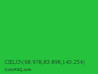 CIELCh 68.978,83.898,140.254 Color is a normal green color and the nearest color is Lime Green #32cd32. Hex code #25c23d and RGB value is rgb(37,194,61). In RGB color space, this color is composed of 15% red, 76% green, 24% blue, In CMYK color space, this color is composed of 81% cyan, 0% magenta, 69% yellow , 24% black , In HSL color space, this color has a hue angle of 129° , 68% saturation and 45% lightness.