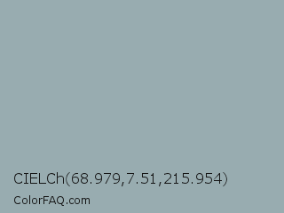 CIELCh 68.979,7.51,215.954 Color is a light cyan color and the nearest color is Gull Gray #9dacb7. Hex code #98acb0 and RGB value is rgb(152,172,176). In RGB color space, this color is composed of 60% red, 67% green, 69% blue, In CMYK color space, this color is composed of 14% cyan, 2% magenta, 0% yellow , 31% black , In HSL color space, this color has a hue angle of 190° , 13% saturation and 64% lightness.
