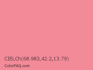 CIELCh 68.983,42.2,13.79 Color is a light red color and the nearest color is Sea Pink #ed989e. Hex code #f28a98 and RGB value is rgb(242,138,152). In RGB color space, this color is composed of 95% red, 54% green, 60% blue, In CMYK color space, this color is composed of 0% cyan, 43% magenta, 37% yellow , 5% black , In HSL color space, this color has a hue angle of 352° , 80% saturation and 75% lightness.