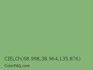 CIELCh 68.998,38.964,135.876 Color is a normal green color and the nearest color is Asparagus #87a96b. Hex code #85b576 and RGB value is rgb(133,181,118). In RGB color space, this color is composed of 52% red, 71% green, 46% blue, In CMYK color space, this color is composed of 27% cyan, 0% magenta, 35% yellow , 29% black , In HSL color space, this color has a hue angle of 106° , 30% saturation and 59% lightness.