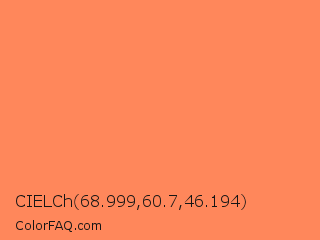 CIELCh 68.999,60.7,46.194 Color is a light orange color and the nearest color is Coral #ff7f50. Hex code #ff875b and RGB value is rgb(255,135,91). In RGB color space, this color is composed of 100% red, 53% green, 36% blue, In CMYK color space, this color is composed of 0% cyan, 47% magenta, 64% yellow , 0% black , In HSL color space, this color has a hue angle of 16° , 100% saturation and 68% lightness.