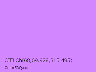CIELCh 68,69.928,315.495 Color is a light purple color and the nearest color is Pale Violet #cc99ff. Hex code #d286ff and RGB value is rgb(210,134,255). In RGB color space, this color is composed of 82% red, 53% green, 100% blue, In CMYK color space, this color is composed of 18% cyan, 47% magenta, 0% yellow , 0% black , In HSL color space, this color has a hue angle of 278° , 100% saturation and 76% lightness.
