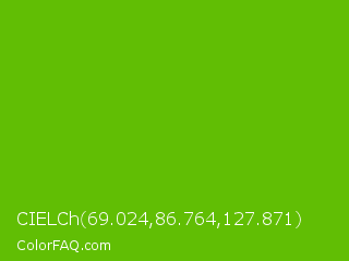 CIELCh 69.024,86.764,127.871 Color is a normal green color and the nearest color is Christi #67a712. Hex code #61be04 and RGB value is rgb(97,190,4). In RGB color space, this color is composed of 38% red, 75% green, 2% blue, In CMYK color space, this color is composed of 49% cyan, 0% magenta, 98% yellow , 25% black , In HSL color space, this color has a hue angle of 90° , 96% saturation and 38% lightness.