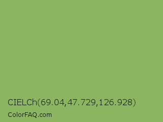 CIELCh 69.04,47.729,126.928 Color is a normal green color and the nearest color is Dollar Bill #85bb65. Hex code #8bb561 and RGB value is rgb(139,181,97). In RGB color space, this color is composed of 55% red, 71% green, 38% blue, In CMYK color space, this color is composed of 23% cyan, 0% magenta, 46% yellow , 29% black , In HSL color space, this color has a hue angle of 90° , 36% saturation and 55% lightness.