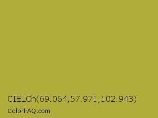 CIELCh 69.064,57.971,102.943 Color is a normal yellow color and the nearest color is Brass #b5a642. Hex code #b0ad3b and RGB value is rgb(176,173,59). In RGB color space, this color is composed of 69% red, 68% green, 23% blue, In CMYK color space, this color is composed of 0% cyan, 2% magenta, 66% yellow , 31% black , In HSL color space, this color has a hue angle of 58° , 50% saturation and 46% lightness.