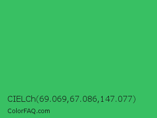 CIELCh 69.069,67.086,147.077 Color is a normal green color and the nearest color is Medium Sea Green #3cb371. Hex code #38c063 and RGB value is rgb(56,192,99). In RGB color space, this color is composed of 22% red, 75% green, 39% blue, In CMYK color space, this color is composed of 71% cyan, 0% magenta, 48% yellow , 25% black , In HSL color space, this color has a hue angle of 139° , 55% saturation and 49% lightness.
