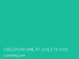 CIELCh 69.098,47.104,173.103 Color is a normal cyan color and the nearest color is Light Sea Green #20b2aa. Hex code #1abe9d and RGB value is rgb(26,190,157). In RGB color space, this color is composed of 10% red, 75% green, 62% blue, In CMYK color space, this color is composed of 86% cyan, 0% magenta, 17% yellow , 25% black , In HSL color space, this color has a hue angle of 168° , 76% saturation and 42% lightness.