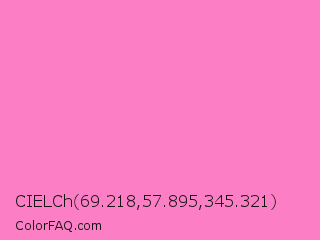 CIELCh 69.218,57.895,345.321 Color is a light magenta color and the nearest color is Persian Pink #f77fbe. Hex code #fc7ec5 and RGB value is rgb(252,126,197). In RGB color space, this color is composed of 99% red, 49% green, 77% blue, In CMYK color space, this color is composed of 0% cyan, 50% magenta, 22% yellow , 1% black , In HSL color space, this color has a hue angle of 326° , 95% saturation and 74% lightness.