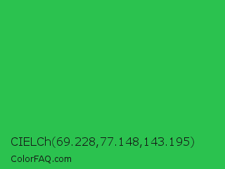 CIELCh 69.228,77.148,143.195 Color is a normal green color and the nearest color is Lime Green #32cd32. Hex code #2bc24f and RGB value is rgb(43,194,79). In RGB color space, this color is composed of 17% red, 76% green, 31% blue, In CMYK color space, this color is composed of 78% cyan, 0% magenta, 59% yellow , 24% black , In HSL color space, this color has a hue angle of 134° , 64% saturation and 46% lightness.