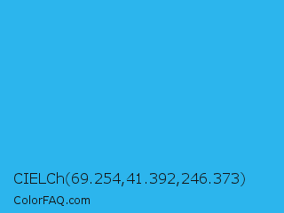 CIELCh 69.254,41.392,246.373 Color is a normal blue color and the nearest color is Button Blue #24a0ed. Hex code #2cb5ed and RGB value is rgb(44,181,237). In RGB color space, this color is composed of 17% red, 71% green, 93% blue, In CMYK color space, this color is composed of 81% cyan, 24% magenta, 0% yellow , 7% black , In HSL color space, this color has a hue angle of 197° , 84% saturation and 55% lightness.