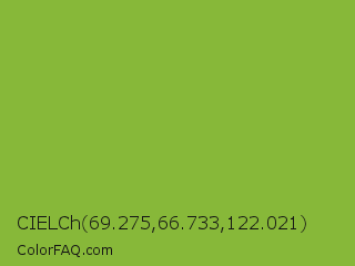 CIELCh 69.275,66.733,122.021 Color is a normal green color and the nearest color is Sushi #87ab39. Hex code #87b839 and RGB value is rgb(135,184,57). In RGB color space, this color is composed of 53% red, 72% green, 22% blue, In CMYK color space, this color is composed of 27% cyan, 0% magenta, 69% yellow , 28% black , In HSL color space, this color has a hue angle of 83° , 53% saturation and 47% lightness.