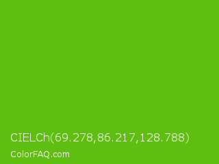 CIELCh 69.278,86.217,128.788 Color is a normal green color and the nearest color is Kelly Green #4cbb17. Hex code #5fbf10 and RGB value is rgb(95,191,16). In RGB color space, this color is composed of 37% red, 75% green, 6% blue, In CMYK color space, this color is composed of 50% cyan, 0% magenta, 92% yellow , 25% black , In HSL color space, this color has a hue angle of 93° , 85% saturation and 41% lightness.