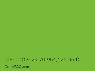 CIELCh 69.29,70.964,126.964 Color is a normal green color and the nearest color is Green RYB #66b032. Hex code #77bb38 and RGB value is rgb(119,187,56). In RGB color space, this color is composed of 47% red, 73% green, 22% blue, In CMYK color space, this color is composed of 36% cyan, 0% magenta, 70% yellow , 27% black , In HSL color space, this color has a hue angle of 91° , 54% saturation and 48% lightness.