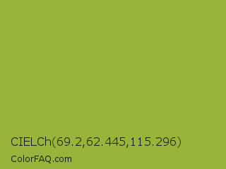 CIELCh 69.2,62.445,115.296 Color is a normal lime color and the nearest color is Sushi #87ab39. Hex code #98b43a and RGB value is rgb(152,180,58). In RGB color space, this color is composed of 60% red, 71% green, 23% blue, In CMYK color space, this color is composed of 16% cyan, 0% magenta, 68% yellow , 29% black , In HSL color space, this color has a hue angle of 74° , 51% saturation and 47% lightness.