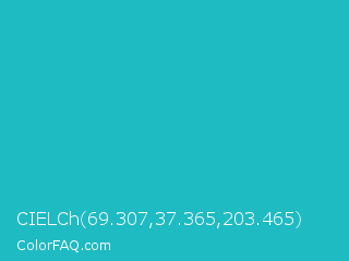 CIELCh 69.307,37.365,203.465 Color is a normal cyan color and the nearest color is Java #1fc2c2. Hex code #1fbbc3 and RGB value is rgb(31,187,195). In RGB color space, this color is composed of 12% red, 73% green, 76% blue, In CMYK color space, this color is composed of 84% cyan, 4% magenta, 0% yellow , 24% black , In HSL color space, this color has a hue angle of 183° , 73% saturation and 44% lightness.
