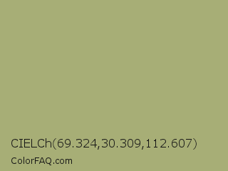CIELCh 69.324,30.309,112.607 Color is a normal yellow color and the nearest color is Green Smoke #a4af6e. Hex code #a7ae76 and RGB value is rgb(167,174,118). In RGB color space, this color is composed of 65% red, 68% green, 46% blue, In CMYK color space, this color is composed of 4% cyan, 0% magenta, 32% yellow , 32% black , In HSL color space, this color has a hue angle of 68° , 26% saturation and 57% lightness.