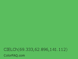 CIELCh 69.333,62.896,141.112 Color is a normal green color and the nearest color is Fern #63b76c. Hex code #5abe5e and RGB value is rgb(90,190,94). In RGB color space, this color is composed of 35% red, 75% green, 37% blue, In CMYK color space, this color is composed of 53% cyan, 0% magenta, 51% yellow , 25% black , In HSL color space, this color has a hue angle of 122° , 43% saturation and 55% lightness.