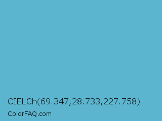 CIELCh 69.347,28.733,227.758 Color is a normal blue color and the nearest color is Shakespeare #4eabd1. Hex code #5cb5cf and RGB value is rgb(92,181,207). In RGB color space, this color is composed of 36% red, 71% green, 81% blue, In CMYK color space, this color is composed of 56% cyan, 13% magenta, 0% yellow , 19% black , In HSL color space, this color has a hue angle of 194° , 55% saturation and 59% lightness.