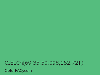 CIELCh 69.35,50.098,152.721 Color is a normal green color and the nearest color is Emerald #50c878. Hex code #55bd7e and RGB value is rgb(85,189,126). In RGB color space, this color is composed of 33% red, 74% green, 49% blue, In CMYK color space, this color is composed of 55% cyan, 0% magenta, 33% yellow , 26% black , In HSL color space, this color has a hue angle of 144° , 44% saturation and 54% lightness.