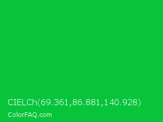 CIELCh 69.361,86.881,140.928 Color is a normal green color and the nearest color is Dark Pastel Green #03c03c. Hex code #08c43b and RGB value is rgb(8,196,59). In RGB color space, this color is composed of 3% red, 77% green, 23% blue, In CMYK color space, this color is composed of 96% cyan, 0% magenta, 70% yellow , 23% black , In HSL color space, this color has a hue angle of 136° , 92% saturation and 40% lightness.