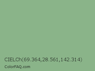 CIELCh 69.364,28.561,142.314 Color is a light green color and the nearest color is Dark Sea Green #8fbc8f. Hex code #8ab489 and RGB value is rgb(138,180,137). In RGB color space, this color is composed of 54% red, 71% green, 54% blue, In CMYK color space, this color is composed of 23% cyan, 0% magenta, 24% yellow , 29% black , In HSL color space, this color has a hue angle of 119° , 22% saturation and 62% lightness.