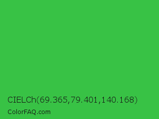 CIELCh 69.365,79.401,140.168 Color is a normal green color and the nearest color is Lime Green #32cd32. Hex code #38c245 and RGB value is rgb(56,194,69). In RGB color space, this color is composed of 22% red, 76% green, 27% blue, In CMYK color space, this color is composed of 71% cyan, 0% magenta, 64% yellow , 24% black , In HSL color space, this color has a hue angle of 126° , 55% saturation and 49% lightness.