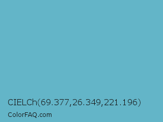 CIELCh 69.377,26.349,221.196 Color is a normal cyan color and the nearest color is Fountain Blue #56b4be. Hex code #63b5c8 and RGB value is rgb(99,181,200). In RGB color space, this color is composed of 39% red, 71% green, 78% blue, In CMYK color space, this color is composed of 51% cyan, 10% magenta, 0% yellow , 22% black , In HSL color space, this color has a hue angle of 191° , 48% saturation and 59% lightness.