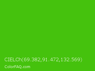 CIELCh 69.382,91.472,132.569 Color is a normal green color and the nearest color is Kelly Green #4cbb17. Hex code #45c20d and RGB value is rgb(69,194,13). In RGB color space, this color is composed of 27% red, 76% green, 5% blue, In CMYK color space, this color is composed of 64% cyan, 0% magenta, 93% yellow , 24% black , In HSL color space, this color has a hue angle of 101° , 87% saturation and 41% lightness.