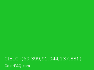 CIELCh 69.399,91.044,137.881 Color is a normal green color and the nearest color is Lime Green #32cd32. Hex code #1dc429 and RGB value is rgb(29,196,41). In RGB color space, this color is composed of 11% red, 77% green, 16% blue, In CMYK color space, this color is composed of 85% cyan, 0% magenta, 79% yellow , 23% black , In HSL color space, this color has a hue angle of 124° , 74% saturation and 44% lightness.