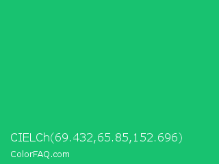 CIELCh 69.432,65.85,152.696 Color is a normal green color and the nearest color is Green Crayola #1cac78. Hex code #18c270 and RGB value is rgb(24,194,112). In RGB color space, this color is composed of 9% red, 76% green, 44% blue, In CMYK color space, this color is composed of 88% cyan, 0% magenta, 42% yellow , 24% black , In HSL color space, this color has a hue angle of 151° , 78% saturation and 43% lightness.
