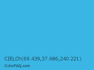 CIELCh 69.439,37.686,240.221 Color is a normal blue color and the nearest color is Picton Blue #45b1e8. Hex code #3ab6e4 and RGB value is rgb(58,182,228). In RGB color space, this color is composed of 23% red, 71% green, 89% blue, In CMYK color space, this color is composed of 75% cyan, 20% magenta, 0% yellow , 11% black , In HSL color space, this color has a hue angle of 196° , 76% saturation and 56% lightness.