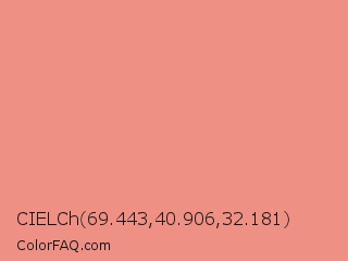 CIELCh 69.443,40.906,32.181 Color is a light red color and the nearest color is Dark Salmon #e9967a. Hex code #ef9084 and RGB value is rgb(239,144,132). In RGB color space, this color is composed of 94% red, 56% green, 52% blue, In CMYK color space, this color is composed of 0% cyan, 40% magenta, 45% yellow , 6% black , In HSL color space, this color has a hue angle of 7° , 77% saturation and 73% lightness.