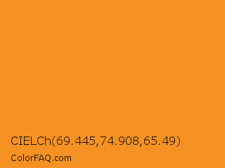 CIELCh 69.445,74.908,65.49 Color is a normal orange color and the nearest color is Carrot Orange #ed9121. Hex code #f69123 and RGB value is rgb(246,145,35). In RGB color space, this color is composed of 96% red, 57% green, 14% blue, In CMYK color space, this color is composed of 0% cyan, 41% magenta, 86% yellow , 4% black , In HSL color space, this color has a hue angle of 31° , 92% saturation and 55% lightness.