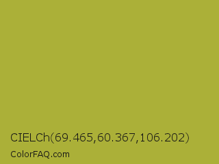 CIELCh 69.465,60.367,106.202 Color is a normal yellow color and the nearest color is Brass #b5a642. Hex code #abb038 and RGB value is rgb(171,176,56). In RGB color space, this color is composed of 67% red, 69% green, 22% blue, In CMYK color space, this color is composed of 3% cyan, 0% magenta, 68% yellow , 31% black , In HSL color space, this color has a hue angle of 63° , 52% saturation and 45% lightness.