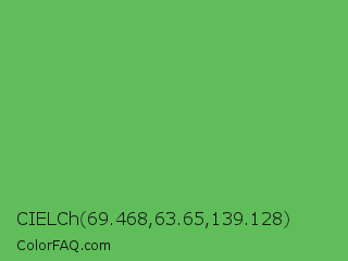 CIELCh 69.468,63.65,139.128 Color is a normal green color and the nearest color is Fern #63b76c. Hex code #5fbe5a and RGB value is rgb(95,190,90). In RGB color space, this color is composed of 37% red, 75% green, 35% blue, In CMYK color space, this color is composed of 50% cyan, 0% magenta, 53% yellow , 25% black , In HSL color space, this color has a hue angle of 117° , 43% saturation and 55% lightness.