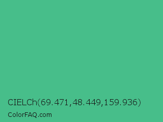 CIELCh 69.471,48.449,159.936 Color is a normal green color and the nearest color is Ocean Green #48bf91. Hex code #47be8a and RGB value is rgb(71,190,138). In RGB color space, this color is composed of 28% red, 75% green, 54% blue, In CMYK color space, this color is composed of 63% cyan, 0% magenta, 27% yellow , 25% black , In HSL color space, this color has a hue angle of 154° , 48% saturation and 51% lightness.